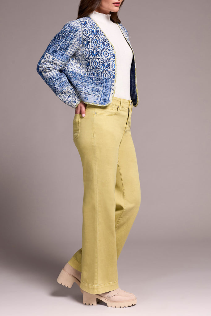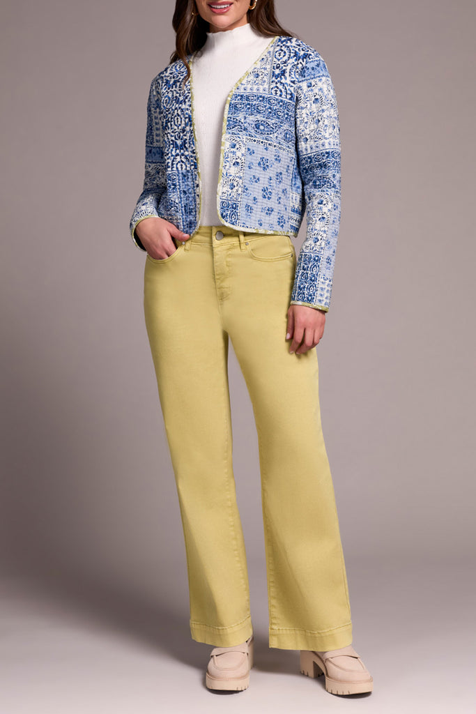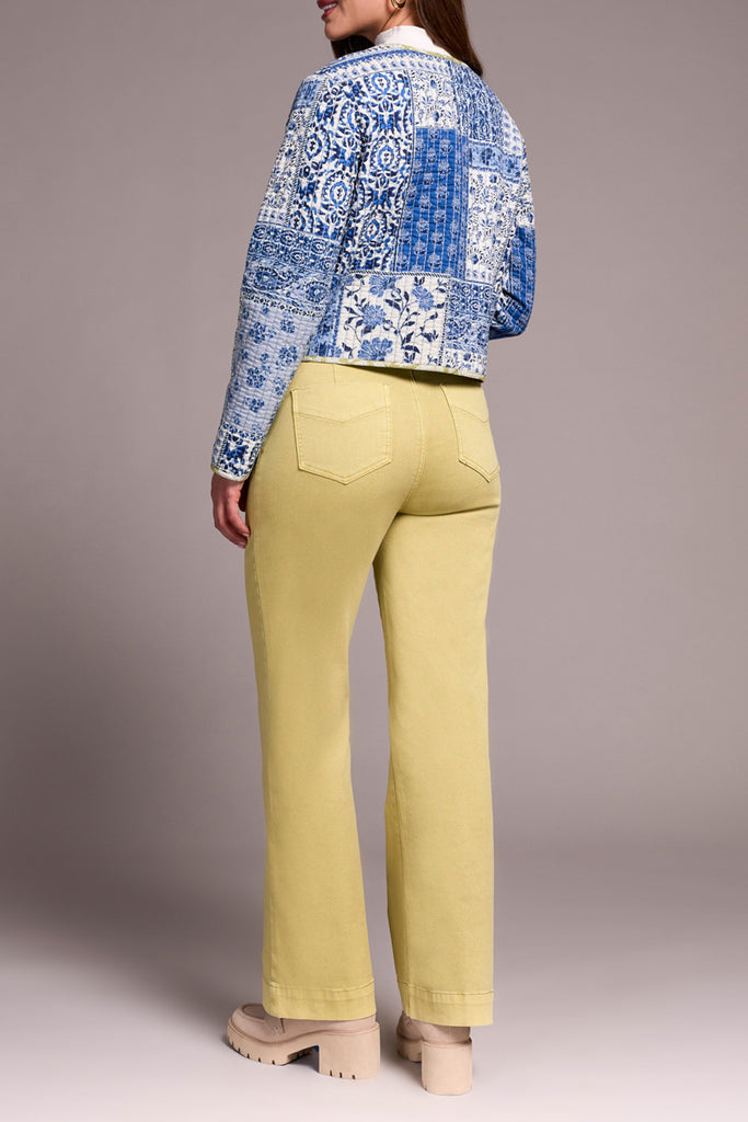 Tribal quilted cotton patchwork reversible jacket in ultra blue color. 2 jackets in 1 reverses to a solid ultra blue color on the other side with the same leek color trim. pairs back well with our Tribal leek color jeans pants as shown in the photos